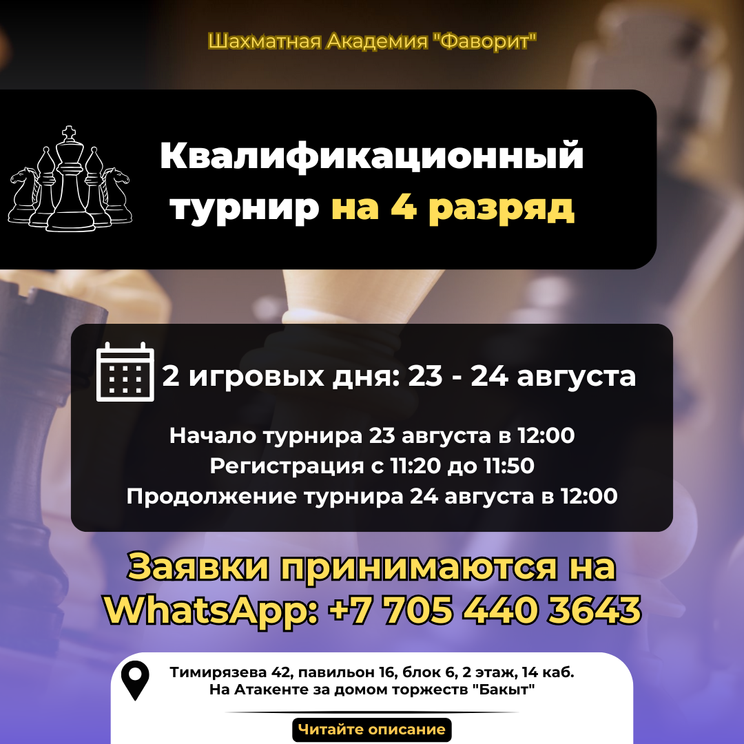 Шахматная Академия "ФАВОРИТ" приглашает приятно провести время и повысить свой уровень игры в квалификационном турнире на "Четвертый разряд"!
