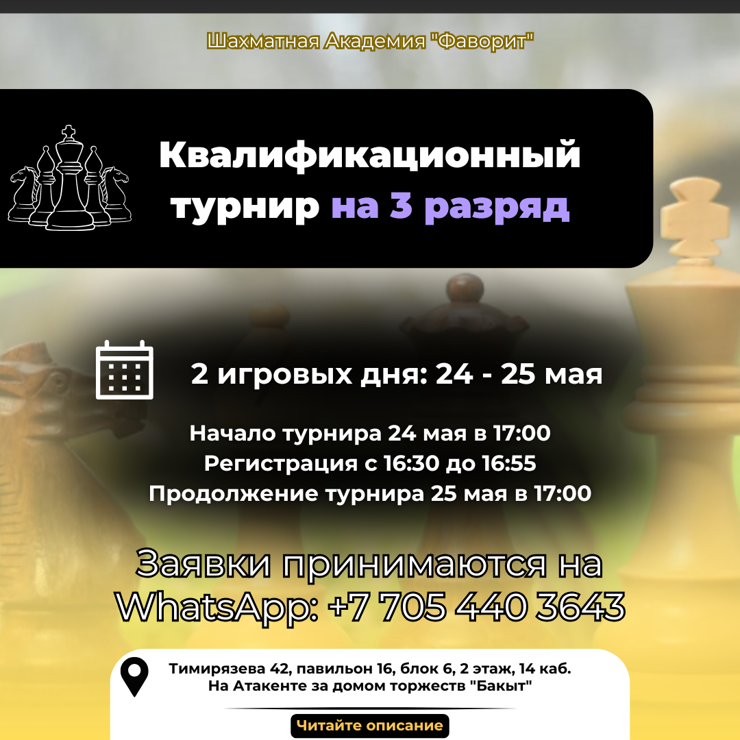 Шахматная Академия "Фаворит" приглашает приятно провести время и повысить свой уровень игры в квалификационном турнире на "Третий разряд"!