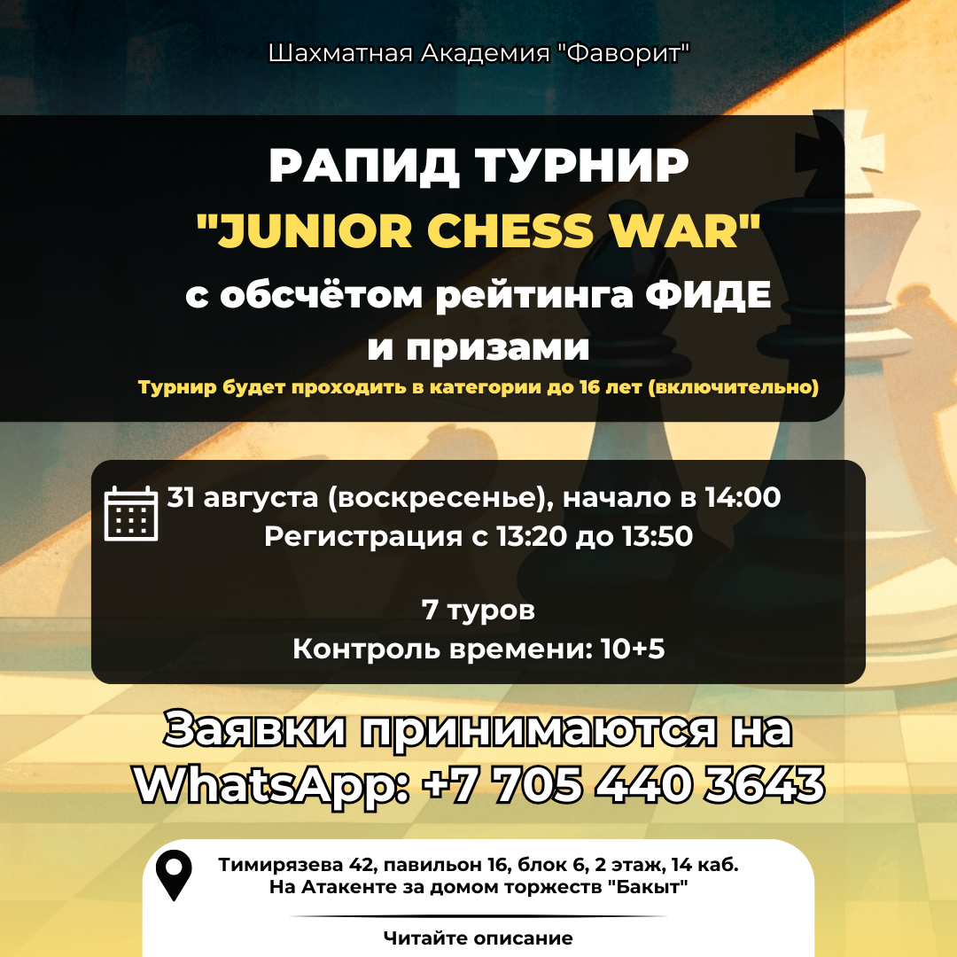 Шахматная Академия "Фаворит" приглашает приятно провести время и повысить уровень игры в турнире с обсчётом рейтинга ФИДЕ "Junior Сhess War"!