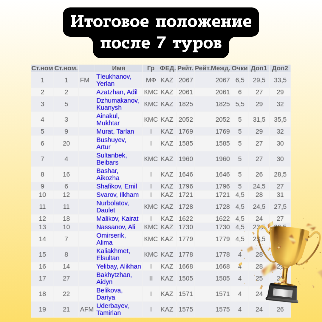 🥇 1-е место и Кубок: Tleukhanov, Yerlan
