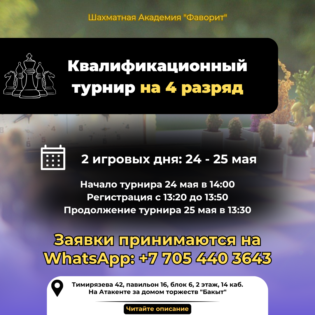 Шахматная Академия "Фаворит" приглашает приятно провести время и повысить свой уровень игры в квалификационном турнире на "Четвертый разряд"!