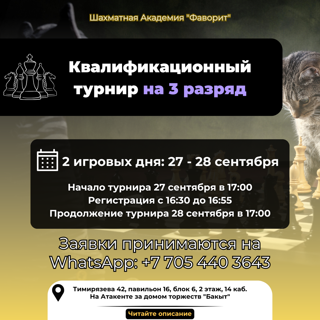 Шахматная Академия "Фаворит" приглашает приятно провести время и повысить свой уровень игры в квалификационном турнире на "Третий разряд"!