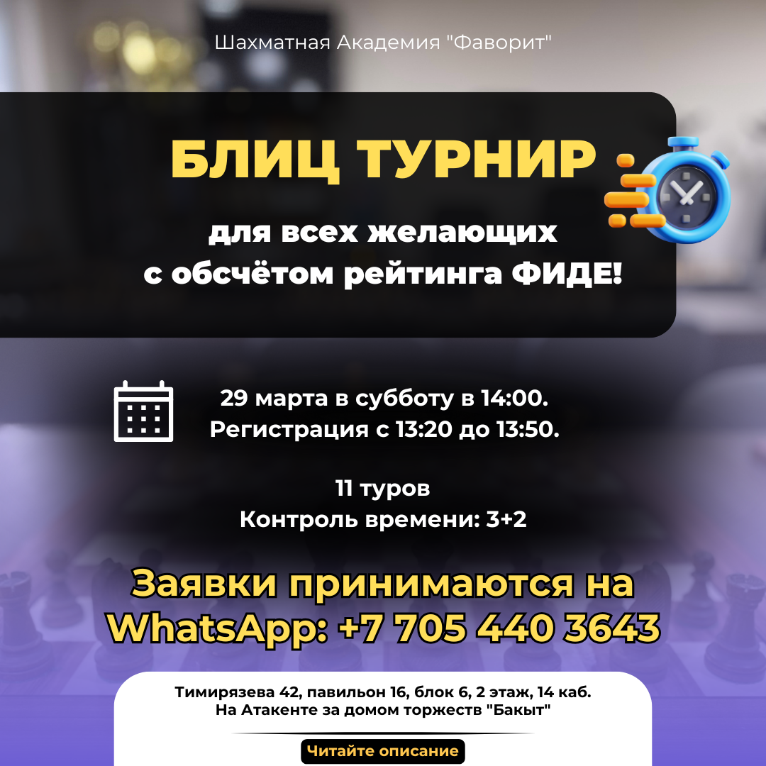 Шахматная Академия "Фаворит" приглашает на "Блиц турнир" для всех желающих с обсчётом рейтинга ФИДЕ!