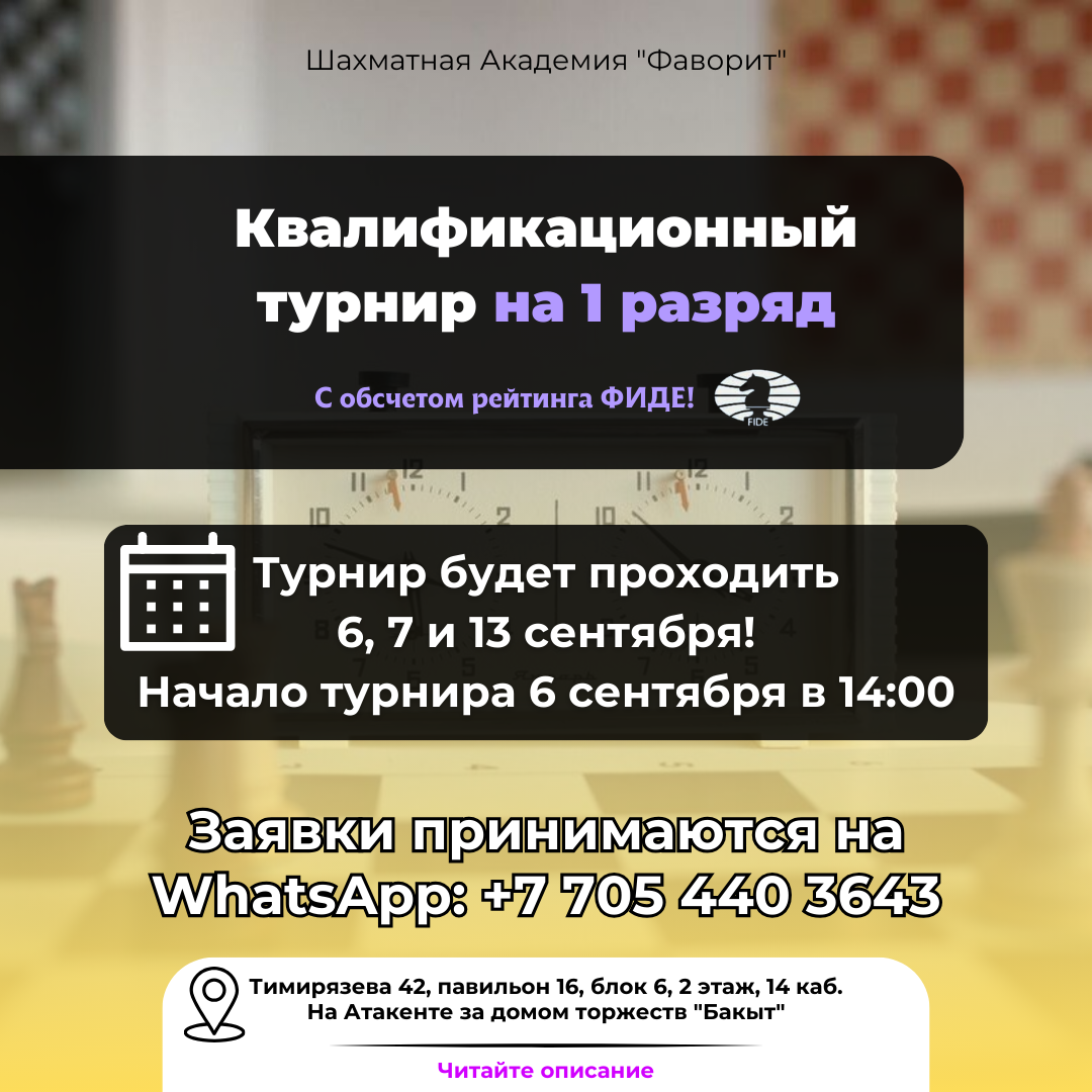 Шахматная Академия "Фаворит" приглашает приятно провести время и повысить свой уровень игры в квалификационном турнире с нормой Первого разряда и обсчётом рейтинга ФИДЕ по классическому контролю времени!